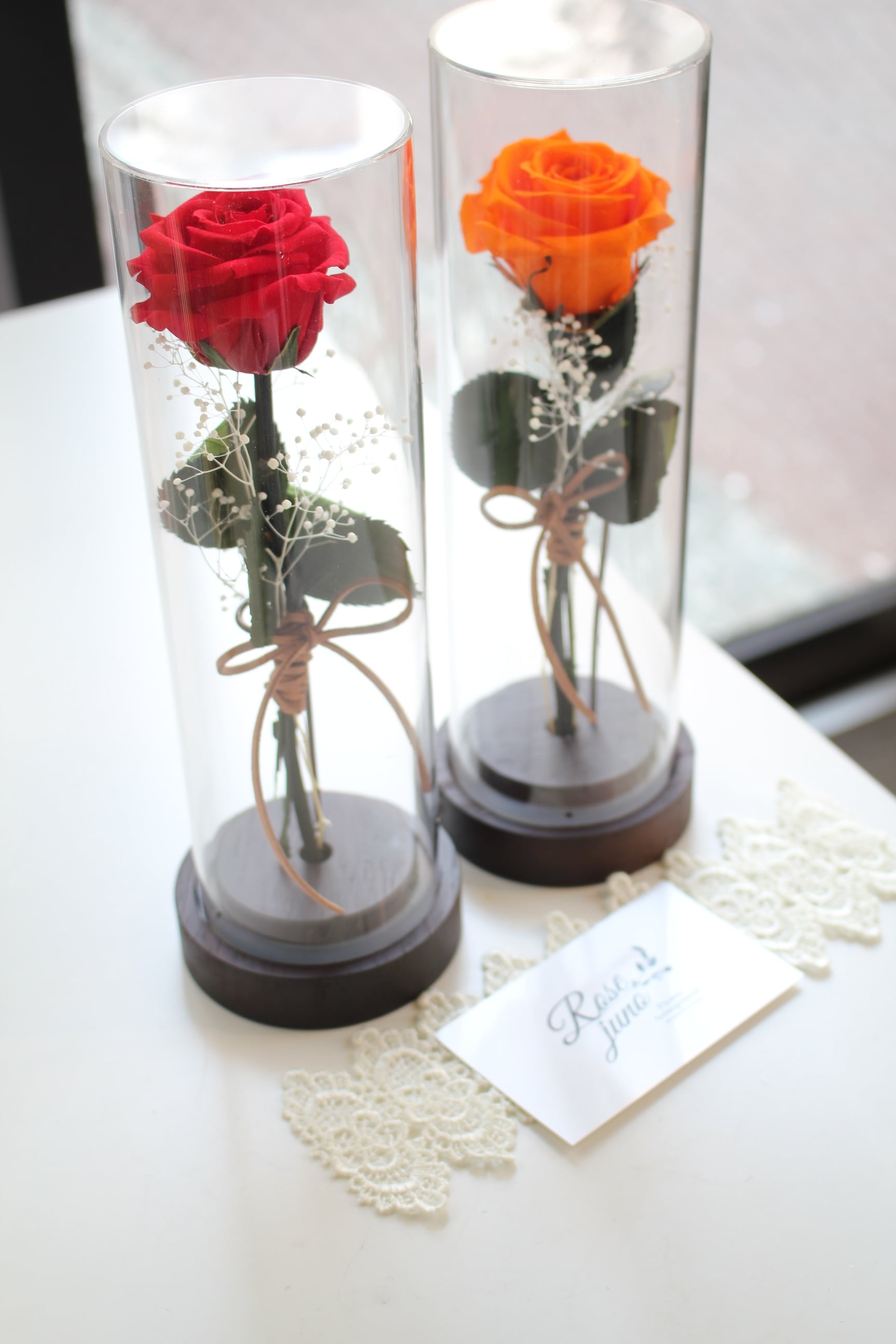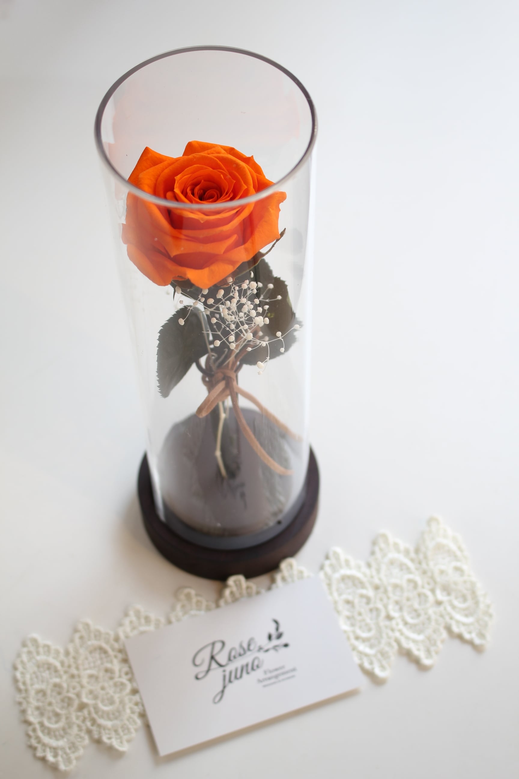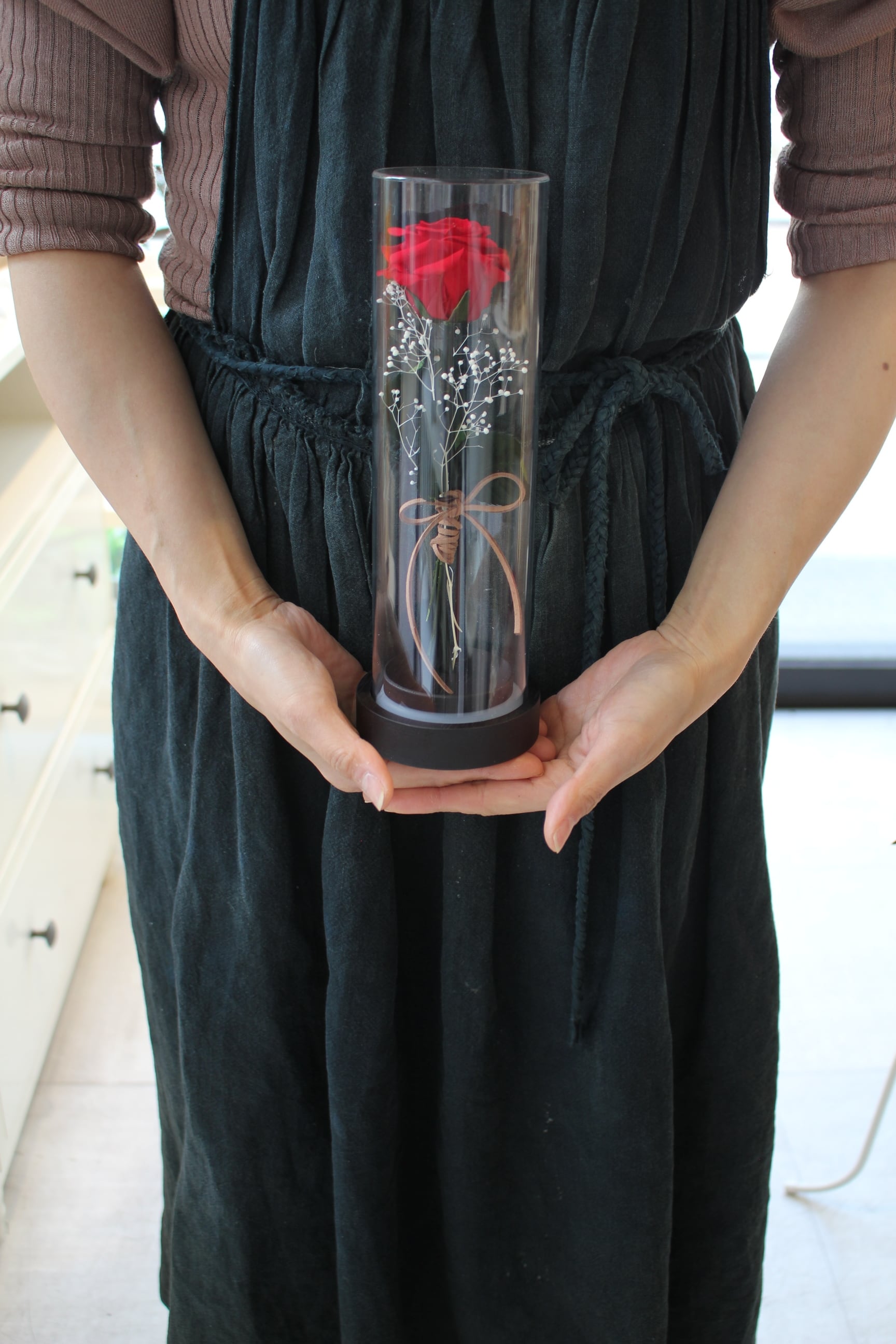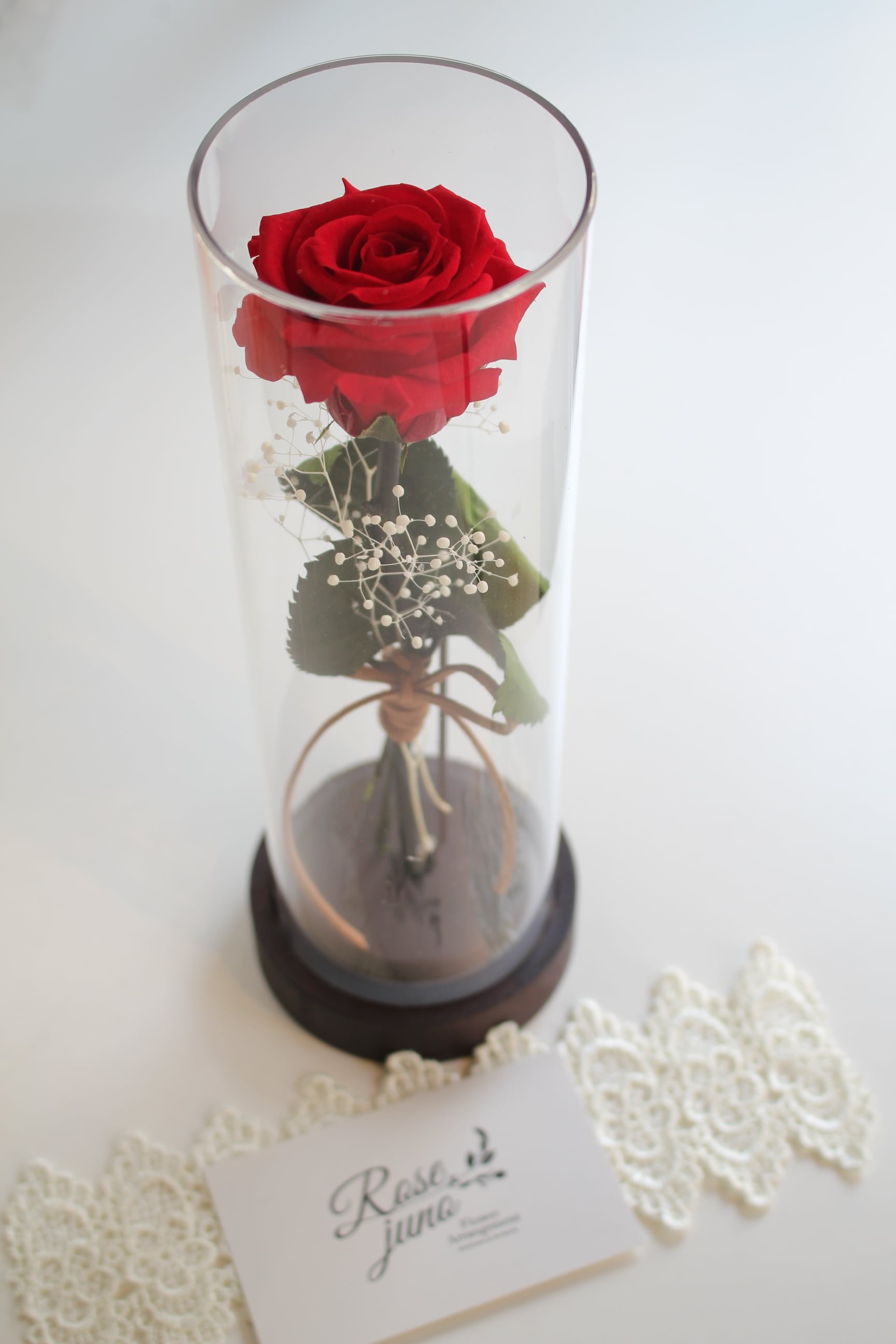 1輪の薔薇とカスミソウを上質な筒状のケースにお入れした