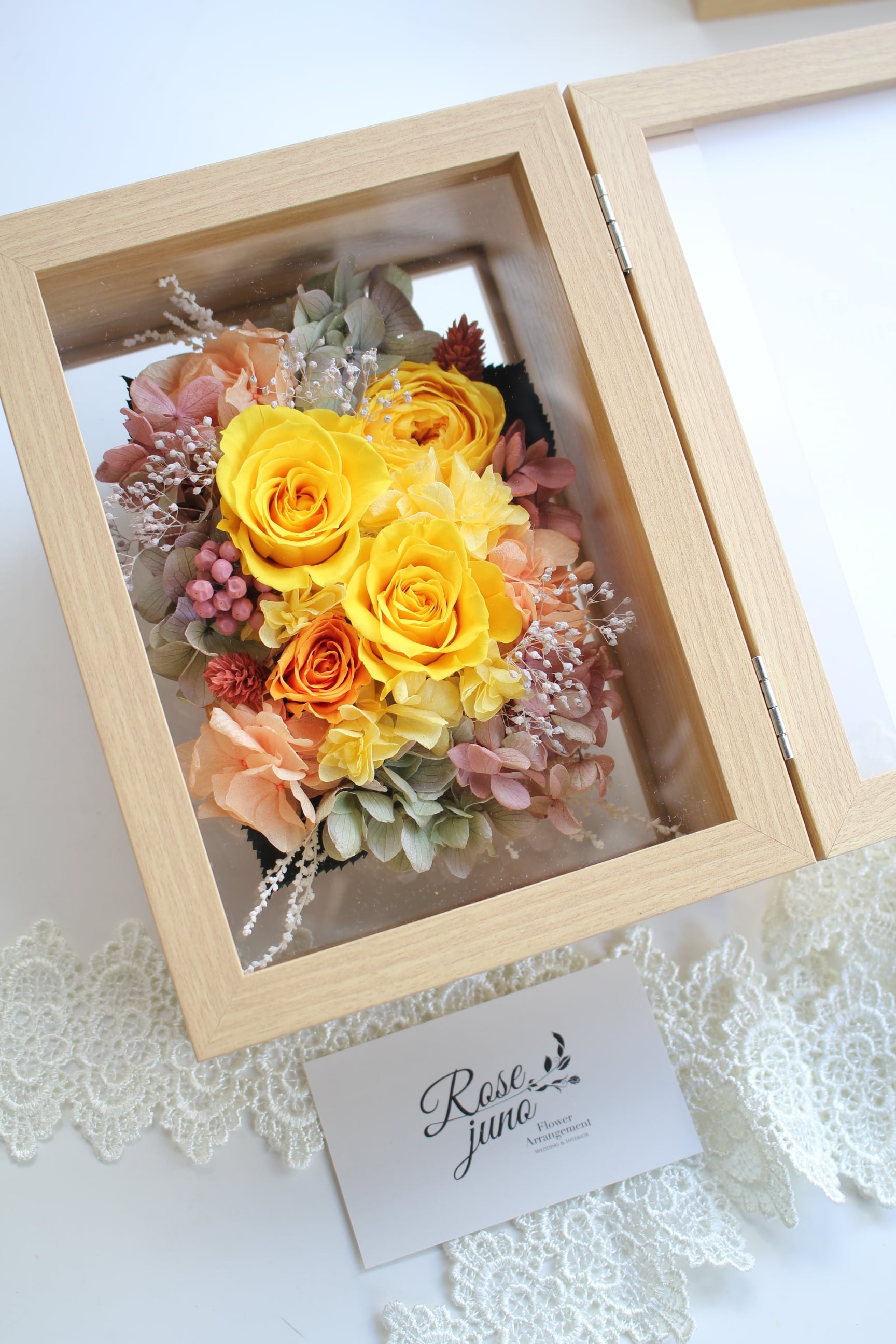 お花がたっぷり入った写真たてのアレンジメントです♪